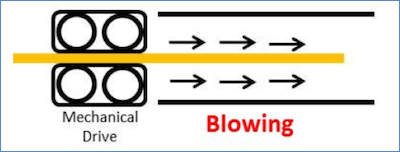 Kábel telepítése csőbe sűrített levegővel. A légáramlat a kábelt a csőben lebegteti, míg a kábelköpeny és a légáramlat közti súrlódás előrehajtó erőt kelt, emiatt a kábel légpárnán úszik be a csőbe. A kábelbefújó gépek pneumatikus vagy hidraulikus hajtású mechanikus kábeltoló egységet is tartalmaznak, ezzel nagy telepítési sebességet és távolságot érnek el. A hidraulikus hajtást nagy fajlagos súlyú kábelek és csőkötegek telepítésére szolgáló gépeknél használják.