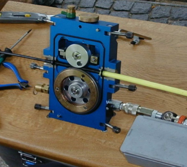 A kábelbefújó eszköz mechanikai előtoló egysége, amely a kábelt elektromos vagy pneumatikus hajtással működtetett recés felületű, egymással szemben forgó kábeltovábbító kerekek révén tolja be a csőbe.