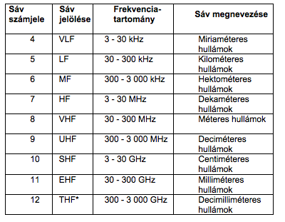 A rádióspektrum Nemzetközi Rádiószabályzat szerinti 9 frekvenciasávra történő felosztása. A frekvencia egysége a hertz (Hz), ennek megfelelően: