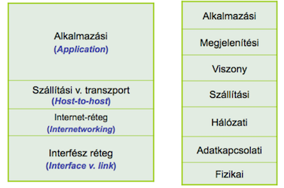 A TCP/IP protokollarchitektúra és a 7-rétegű OSI protokoll-referenciamodell rétegeinek megfeleltetését az ábra mutatja.