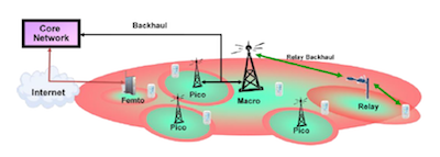 Az ábra egy vegyes hálózatot mutat, amely femtocellát (zárt előfizetői csoport), pikocellát (nyílt előfizetői csoport) és átjátszóállomást tartalmaz: